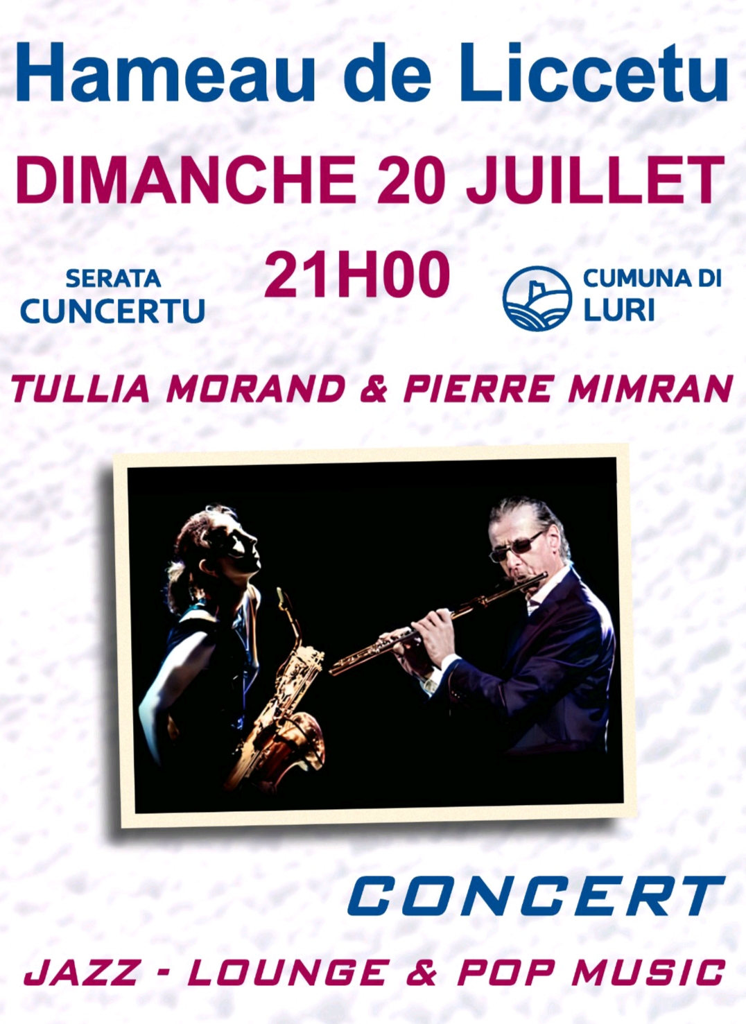 Duo Tullia Morand et Pierre Mimran qui transportera le public dans une ambiance jazzy et variétés à Liccetu dimanche 20 juillet à partir de 21 h. L’entrée sera libre.